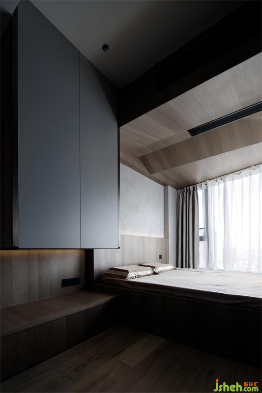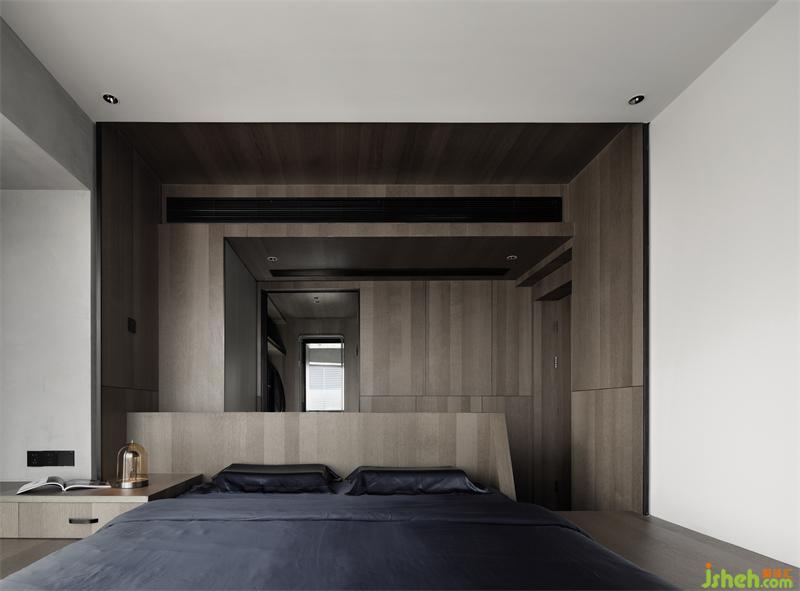 主臥室原來布局過于集中的臥室入口在重新設(shè)計之后消隱在淺色護墻板中,木地板的舒適是赤腳行走享受的基礎(chǔ),同時立面簡單塊面的處理及黑白色的對比讓空間多了一份寧靜。