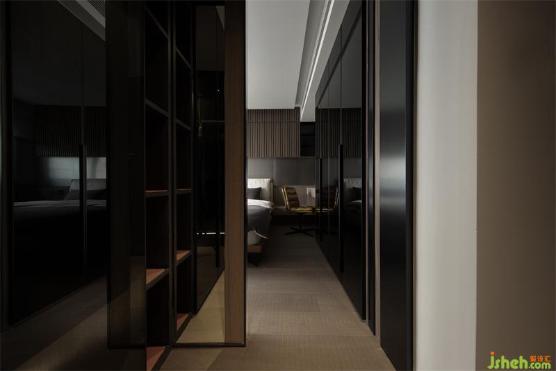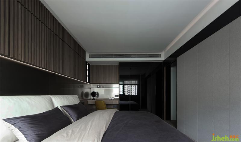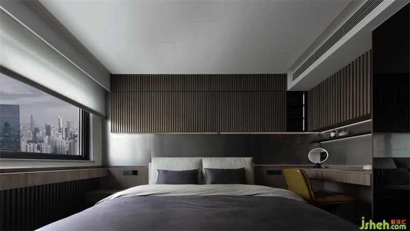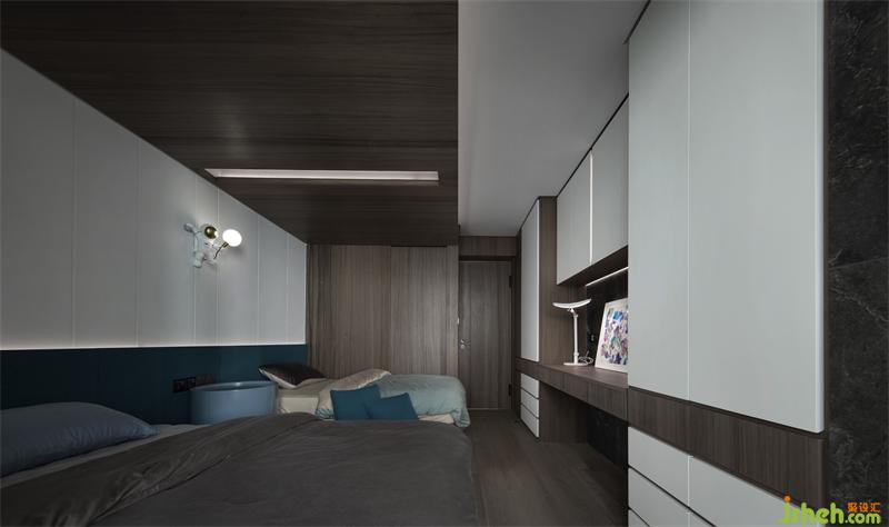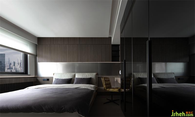 背景以溫潤的木頭材質(zhì)進行呈現(xiàn),格柵的肌理與燈光賦予的流動感,創(chuàng)造出豐富的視覺感官。木子仁設(shè)計霜灰色床品與墻面搭配出自然的層次感,而延伸的柜體在有形與無形之間達到了隱形效果,讓空間看起來更加潔凈有序。