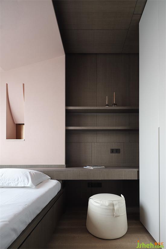 保持溫和平靜,粉色墻面所產(chǎn)生的趣味性,營造出舒緩的松弛感。家裝設(shè)計咖色木飾面為空間注入一抹穩(wěn)重感,調(diào)和空間基調(diào)