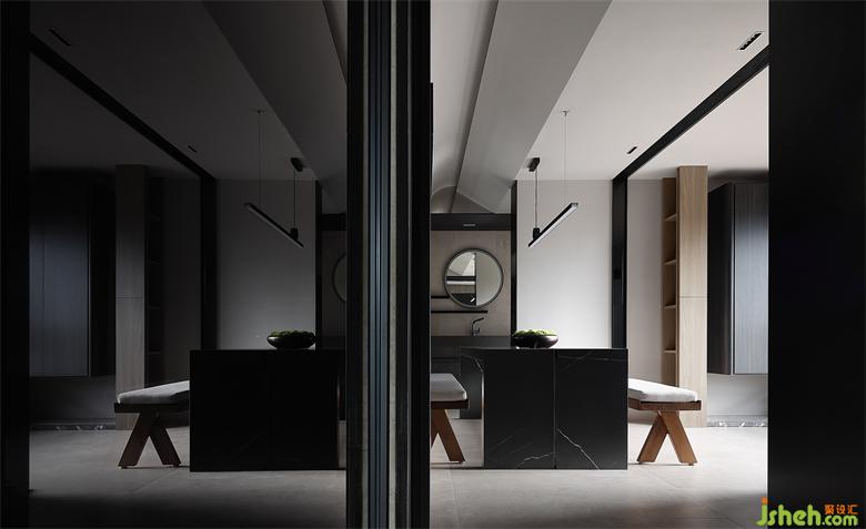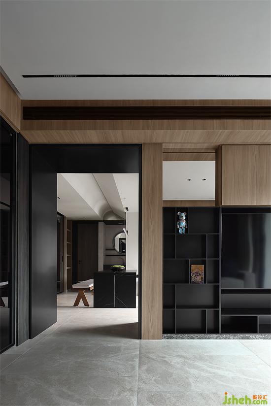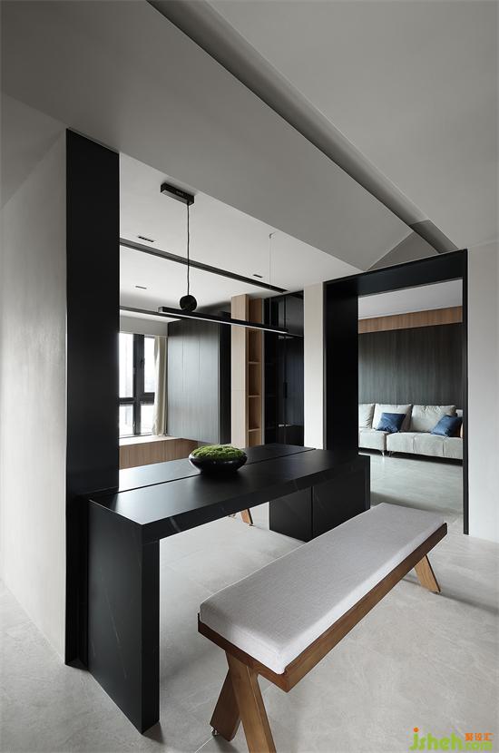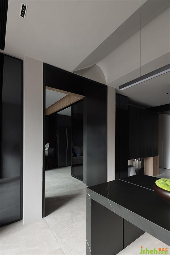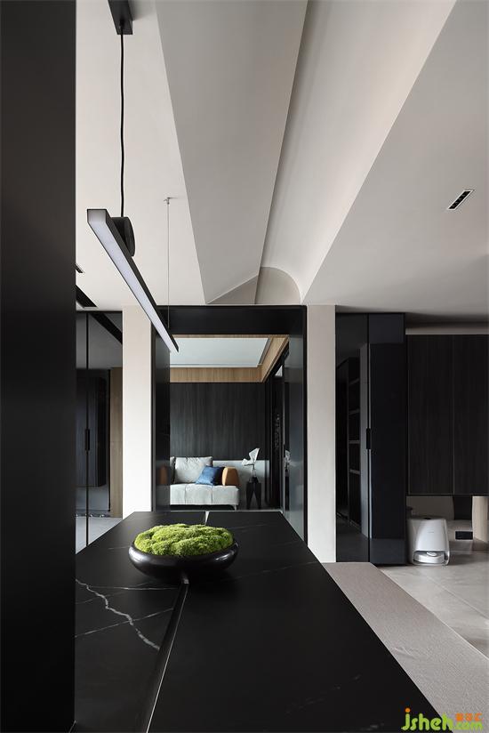 客廳主要由黑白兩色構(gòu)成,通過巖板將空間融合,地面與墻體的材質(zhì)黑色層次分明,讓空間彰顯力量與秩序。家裝設(shè)計(jì)陽(yáng)光透光白紗撒入室內(nèi),讓情緒從力量與秩序中升華,展現(xiàn)出我們對(duì)家的深刻理解。