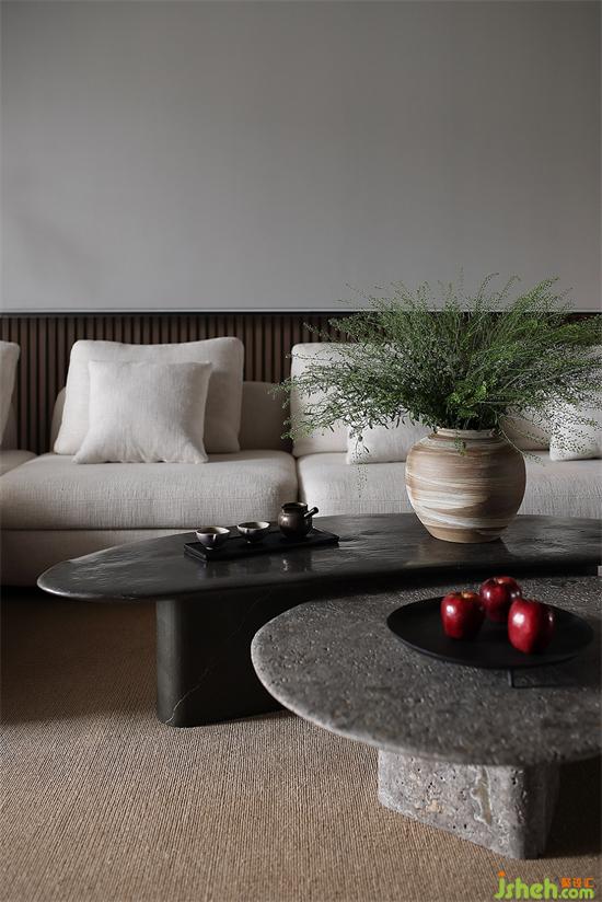 格柵按比例分割,運用垂直豎紋的魅力,拓展了縱深方向的空間敘事;家裝設(shè)計穿插肌理感圖案,糅合拼接形式的錯落游戲,有高有底,有盛開,也有靜默。