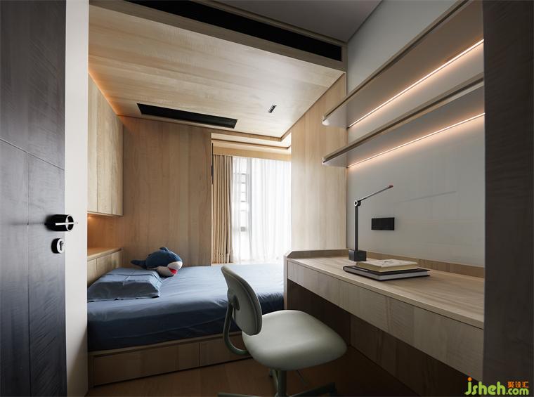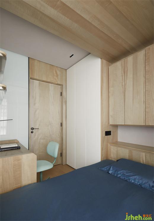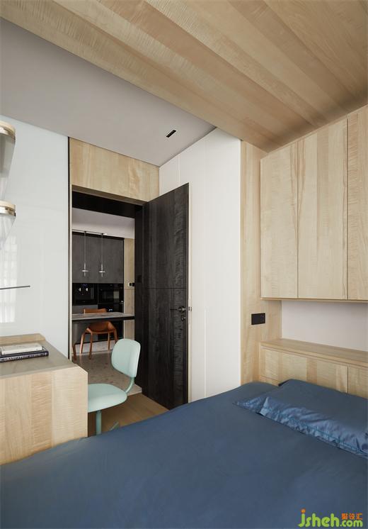 次臥大面積的木作、白色的肌理漆及磁吸玻璃和烤漆的使用,呈現(xiàn)出統(tǒng)一的克制審美,設(shè)計(jì)師支持柔和、舒緩的色調(diào)和紋理,而不是浮華和視覺混亂。