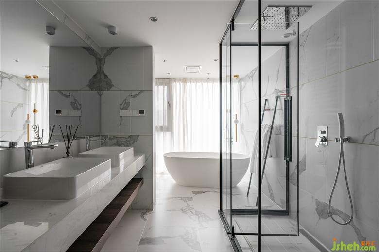 精簡的布置讓衛(wèi)生間顯得格外的干凈和整潔,足夠大的鏡面視覺幾乎可以覆蓋洗漱的空間,洗漱空間之后,加入了浴室,拉開窗簾,拂過落地窗,即是一片江景。泡澡區(qū)也設(shè)有一個小小的隱藏式音響,可以在放松的時候,感受水溫、音樂,酒和風(fēng)景的四重沐浴。