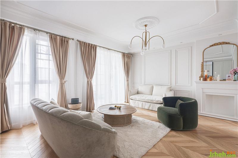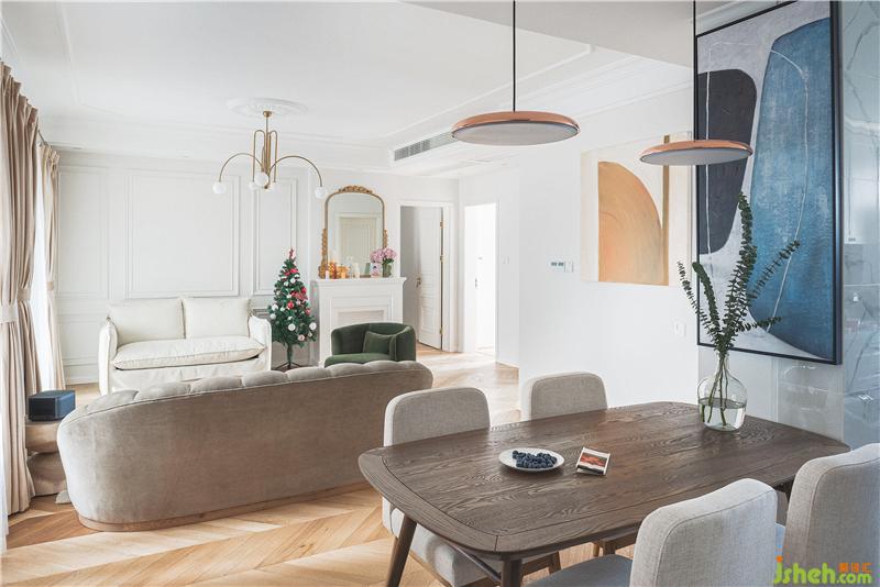 入戶后,客廳餐廳以及廚房的部分一攬入云,整體擴大了視野,由于業(yè)主很喜歡壁爐,所以設(shè)計師在考慮了壁爐之后,便沒有增加電視墻,考慮后期會加入投影儀,于是設(shè)計師將壁爐放于右側(cè),貼墻設(shè)計。為避免旁邊顯得空落,設(shè)計師在臨壁爐旁,放置雙人沙發(fā),相互呼應(yīng)。家具尺寸選的相對袖珍三人沙發(fā)、雙人沙發(fā)和單人沙發(fā)的錯落搭配,加上諾大的雙排大窗,讓整個空間視覺在原有的基礎(chǔ)上擴大化。