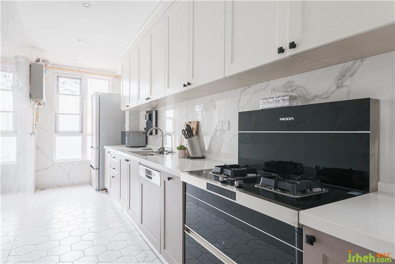 女主人很少下廚,我們將封閉式廚房改造成開放式廚房,一方面是為了打通與客廳之間的連接,讓整個空間顯得更大,另一方面由于客廳的空間狹小,加上餐廳會尤為狹窄,所以設(shè)計師將墻打掉,把餐桌放于客廳與廚房的交界處,并且用六邊形小白磚與木地板連接,顯得空間更有層次感為其一,其二,開放式的布局可以一邊做菜一邊和家人朋友聊天,和大家分享原材料是怎么被加工成美食的這個過程,這非常重要。