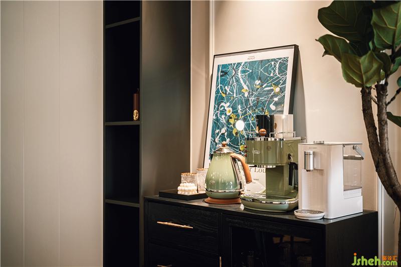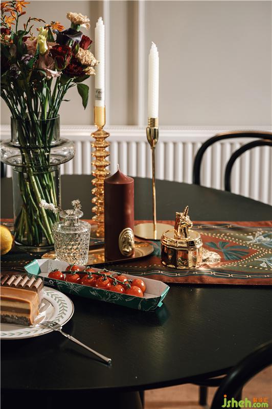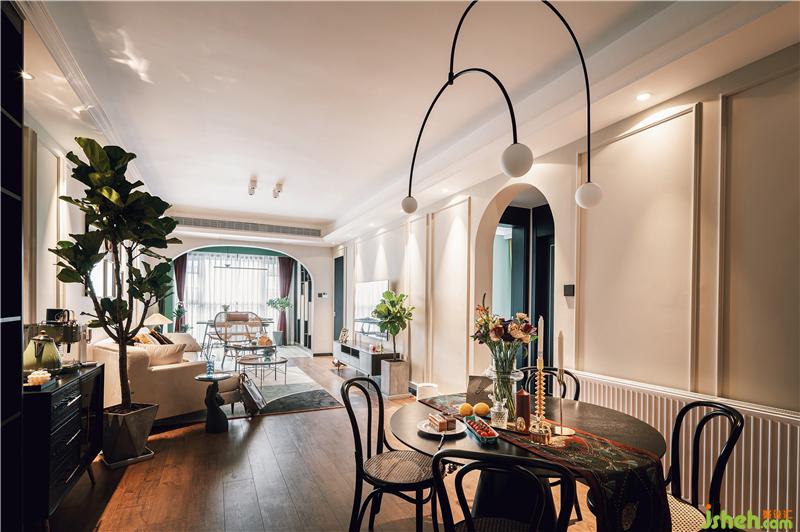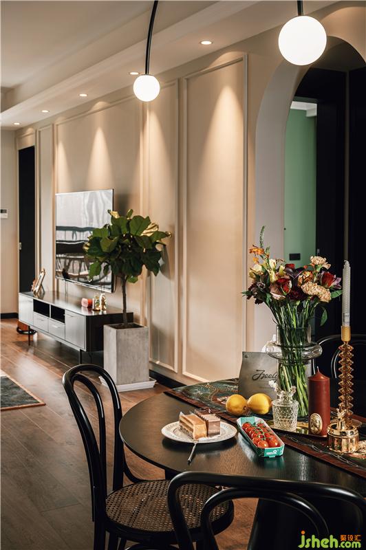 以復(fù)古的石膏盤搭配弧形吊燈,將無主燈客廳與餐廳相區(qū)分,簡約的黑色圓桌與藤編椅,與餐桌上的燭臺(tái)、花束、桌旗等搭配相得益彰。餐廳處設(shè)有一電表箱,用以可開合的裝飾畫所覆蓋,畫上貼有夫妻倆行走過足跡照片,整個(gè)餐廳的氛圍都變得溫暖且有格調(diào)。裝修設(shè)計(jì)