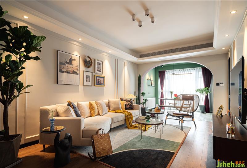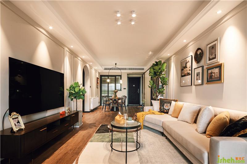 無主燈設(shè)計(jì),使客廳空間更開闊,墻面以白色為主,添加了石膏線,增添了房屋的立體感。所有地面均采用木地板,比地磚會(huì)更有溫度,客廳異形沙發(fā)與室內(nèi)植物相連接,讓整個(gè)空間更具有生機(jī),也有屏風(fēng)隔斷的作用。陽光穿過落地窗灑入屋內(nèi),與一盞懷舊復(fù)古的落地小臺(tái)燈微弱的光,交相輝映。這斑駁的光影,靈動(dòng)且恬靜,讓家具與藝術(shù)品的結(jié)合更加出彩。