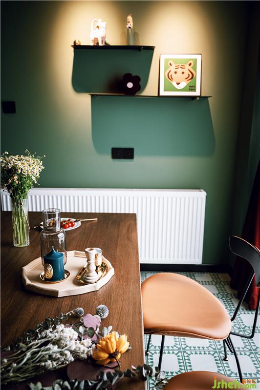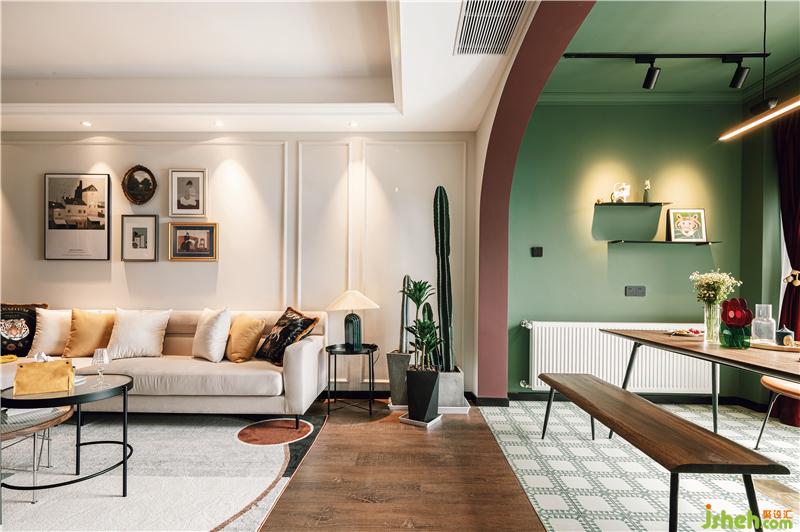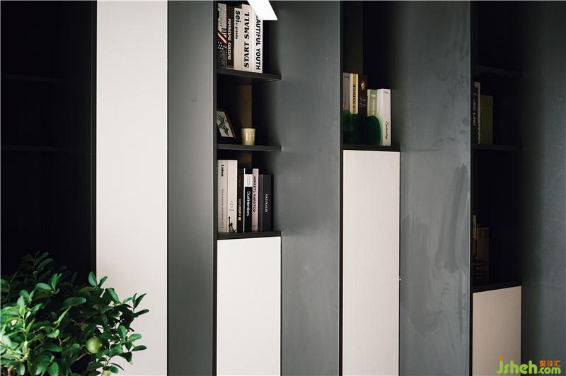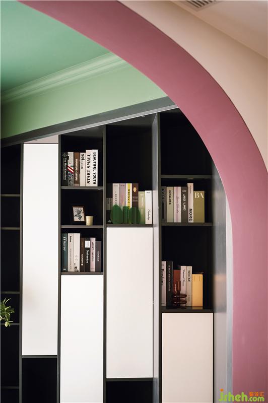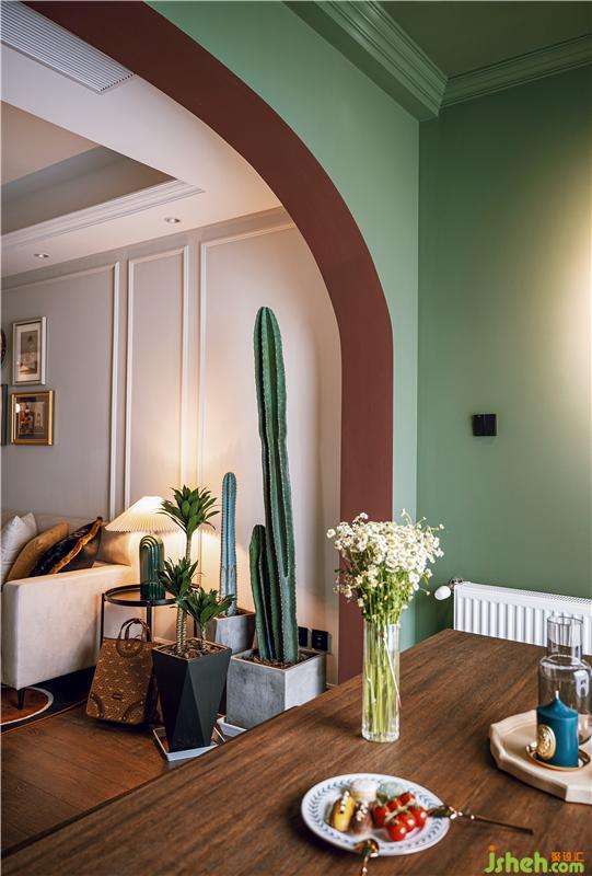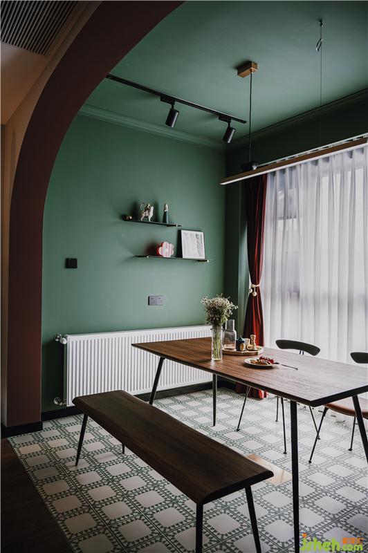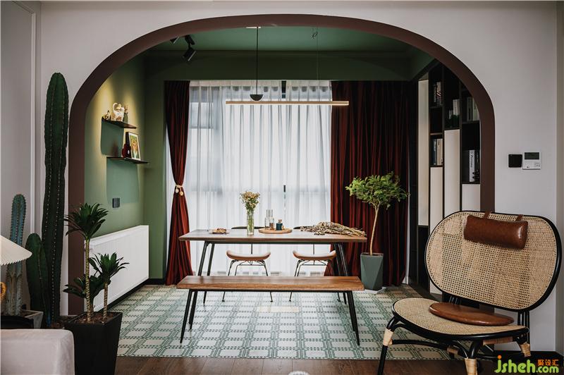 為了烘托花園陽(yáng)臺(tái)為一個(gè)獨(dú)立、重復(fù)古感的區(qū)域,線條流暢的棗紅色圓弧門洞,墻面與頂面都采用墨綠色,給人一種視覺(jué)沖擊感。在此中央放置木質(zhì)長(zhǎng)桌,同時(shí)滿足了辦公和聚餐的需求。陽(yáng)臺(tái)斜面書(shū)柜面向客廳中心區(qū)域,呈半開(kāi)放式設(shè)計(jì),利于清潔,也收納方便。裝修設(shè)計(jì)