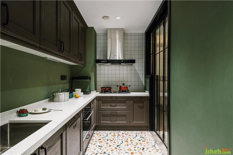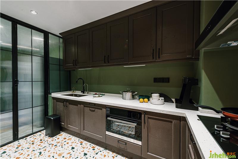 廚房風(fēng)格與客廳呼應(yīng),柜體以奶茶色為主,墻面墨綠色為主,采用長(zhǎng)虹玻璃折疊門(mén),使空間更通透,也別具風(fēng)味。廚房地面采用水磨石瓷磚,讓復(fù)古的房屋增添了一絲清新感。墻面采用MYLANDS的涂料,耐用可反復(fù)擦洗,墨綠色的主調(diào)讓整個(gè)空間多了一抹高級(jí)質(zhì)感。裝修設(shè)計(jì)