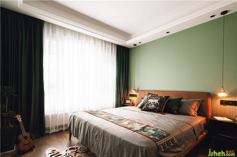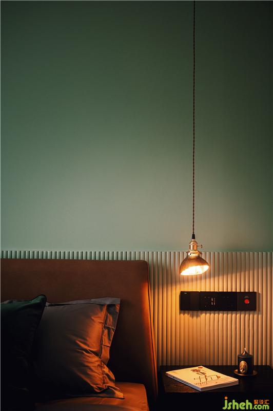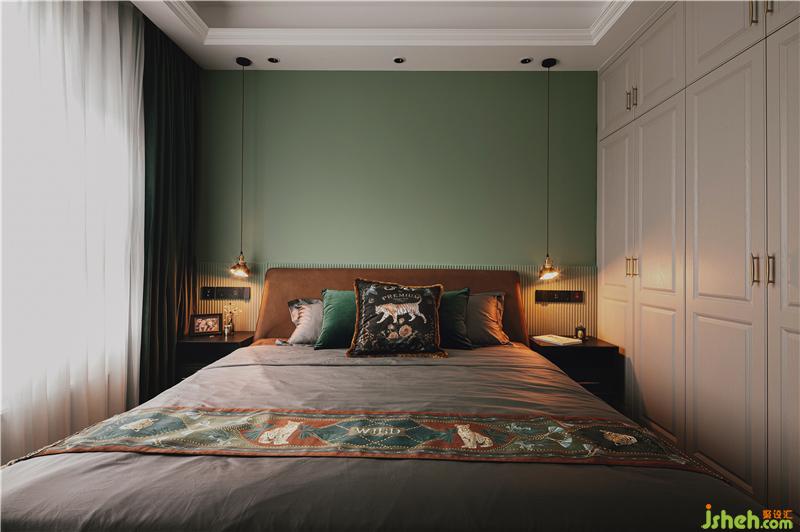 墨綠色的臥室背墻配半墻石膏線(xiàn),使其墻面有立體感不單調(diào),墻上懸掛的復(fù)古壁燈仿佛帶來(lái)了上個(gè)世紀(jì)的復(fù)古華麗,與一旁磚紅色的床頭和墨綠色絲絨窗簾相搭配,溫暖又舒適,素色被單與虎頭抱枕,給臥室又增加了層次感,使得臥室充滿(mǎn)韻味。