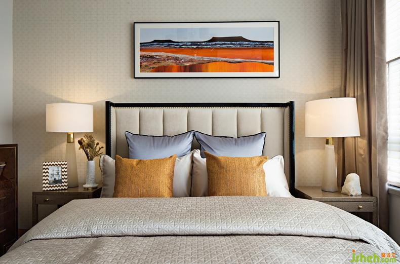 次臥沉穩(wěn)溫潤的米色軟包床搭配抽象掛畫藝術(shù)感十足,舒適高端的定制床品布藝讓居者身臨其境的感受奢華魅力