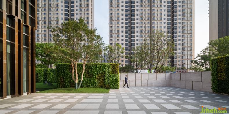 入口廣場(chǎng)由禮序前廳和特色廣場(chǎng)兩個(gè)空間構(gòu)成,后退的景墻設(shè)計(jì)弱化城市與宗地的界分感,同時(shí)空間更顯開闊大氣而又不至于一覽無余,簡(jiǎn)單中的微妙轉(zhuǎn)折,更新著人們的視覺感受。