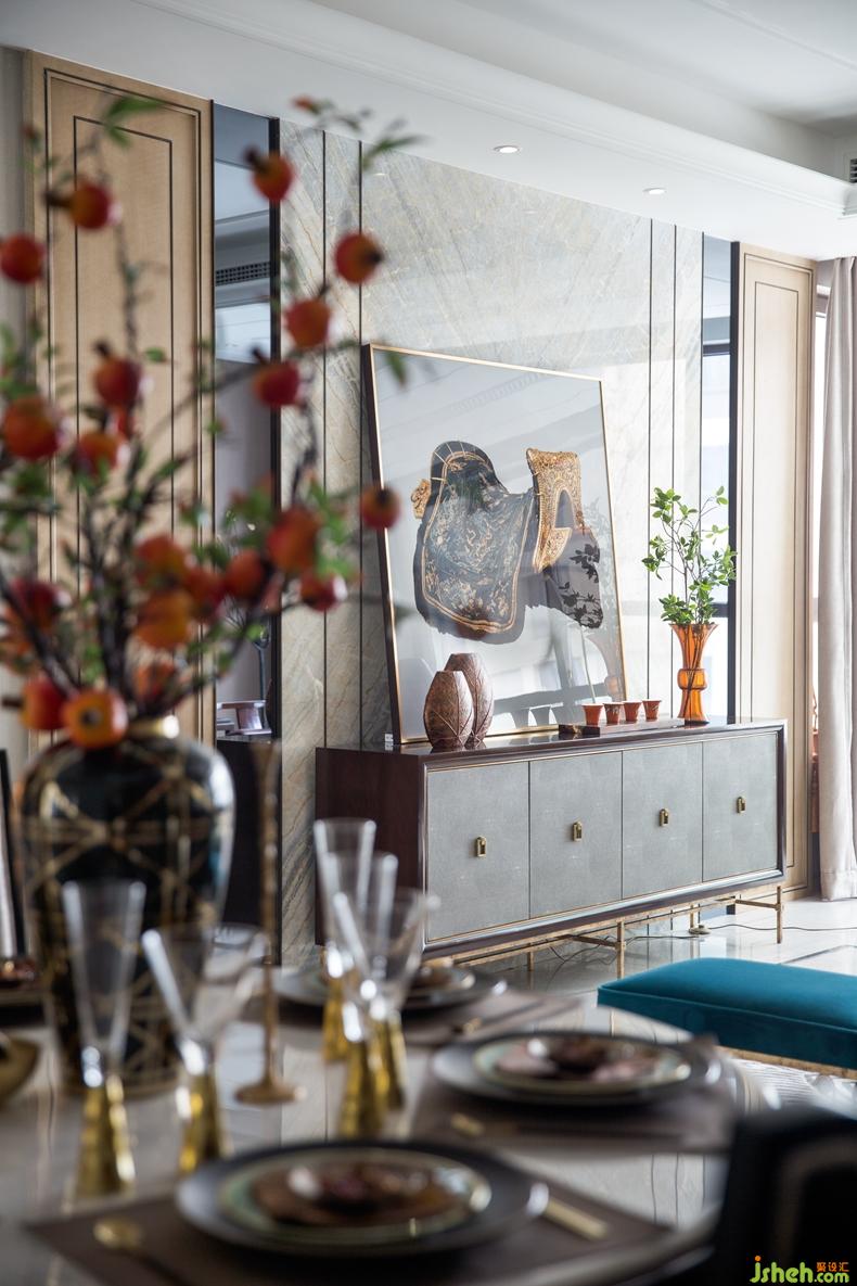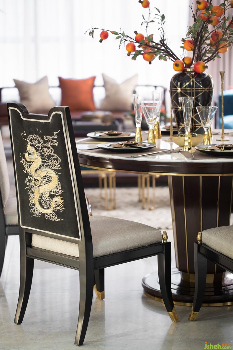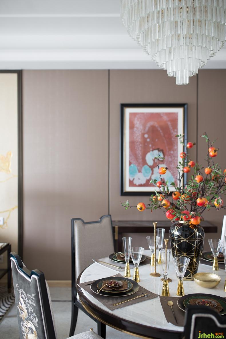 餐廳實木絲質軟包座椅,絲線刺繡織物椅背,形制講究的餐具、掛畫、花藝放置周圍,在精雕細琢的細節(jié)里,在濃郁的文化浸潤中,自然而然的傳達于環(huán)境,豐富居者的視覺感受,亦締造府的風雅世界。