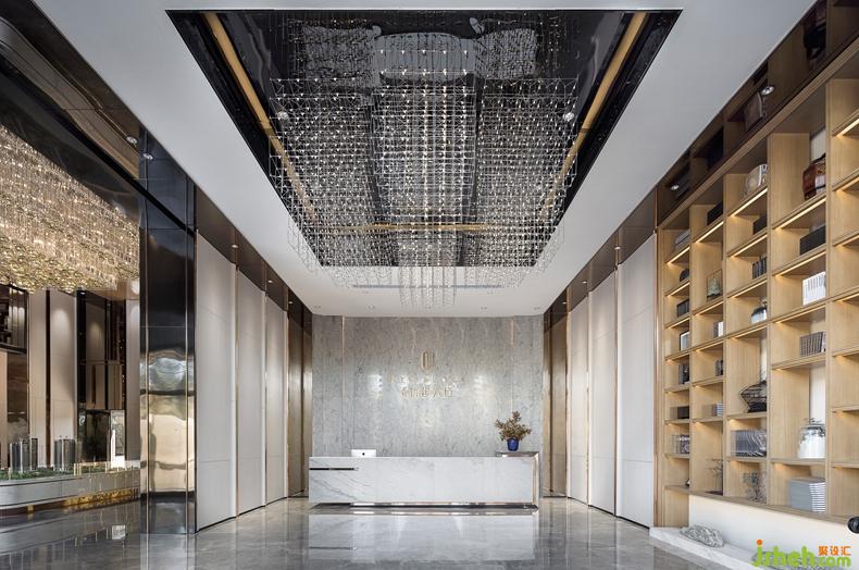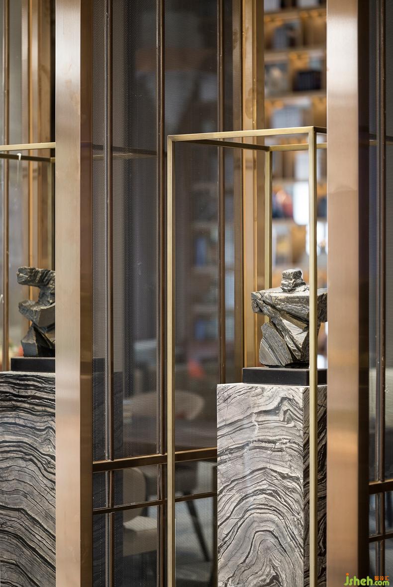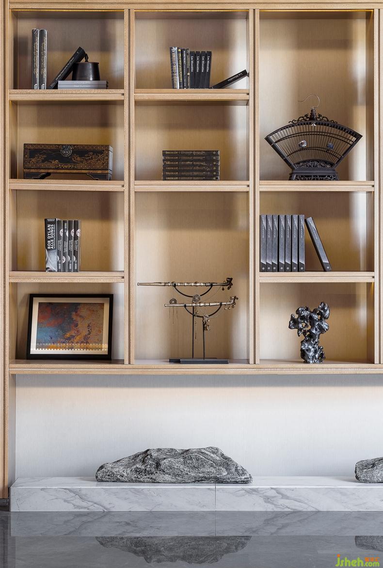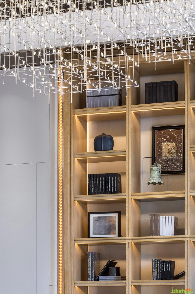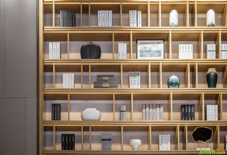 甄選裝飾藝術(shù)品與書籍置于展示墻,打造出一個富有躍動旋律的禮儀空間.