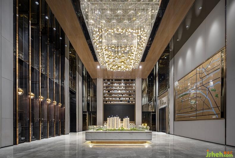 沙盤展示區(qū)大型藝術(shù)吊燈與簡潔明快的整體空間效果相得益彰.