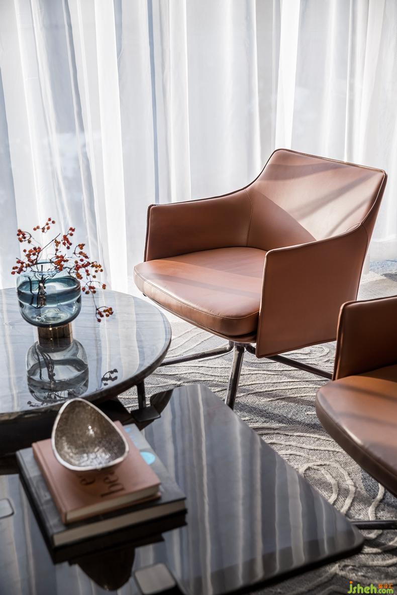 家具造型呼應(yīng)硬裝的幾何線條感,純白紗幔、優(yōu)質(zhì)皮革沙發(fā)、大理石金屬茶幾,與橘色單椅搭配,呈現(xiàn)一種堅(jiān)硬與柔軟并存,光潔與沉穩(wěn)并呈的特殊質(zhì)感,彰顯了空間并不張揚(yáng)的奢裝理念.室內(nèi)設(shè)計(jì)師