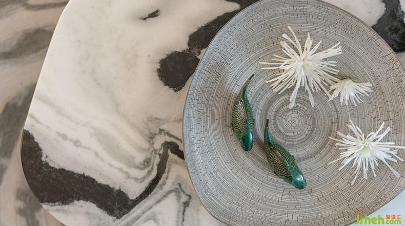 室內(nèi)設(shè)計(jì)師通過(guò)藝術(shù)的手法抒寫藝術(shù)與想象交融的意境對(duì)話,淺棕調(diào)木飾面帶著一方清冷與理性,加之中灰調(diào)背景墻、家具布藝,帶來(lái)素凈、優(yōu)雅視覺(jué)觀感,黑白灰意境大理石紋理描繪出水波蕩漾的波瀾感,東方韻味藝術(shù)品恰到好處地與客廳空間交融,崎嶇的地毯肌理,如同巖石溶洞的時(shí)間記憶,已然超乎于生活之上