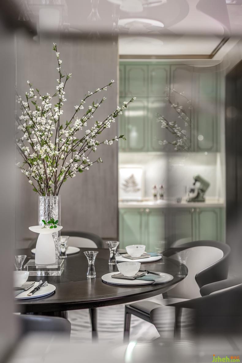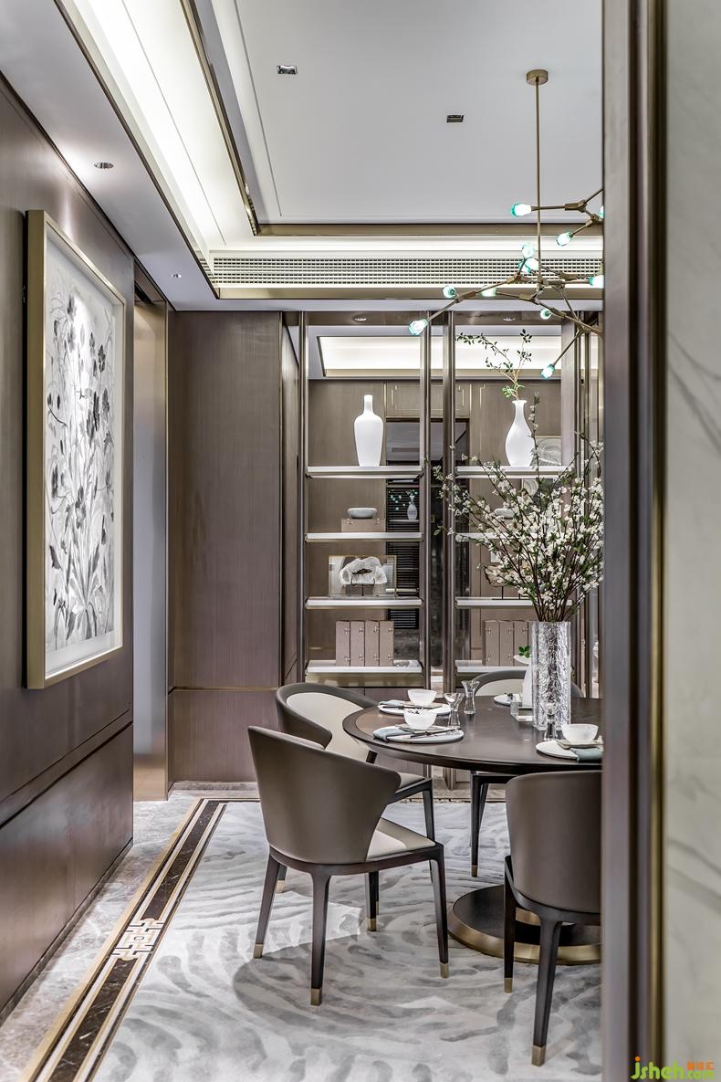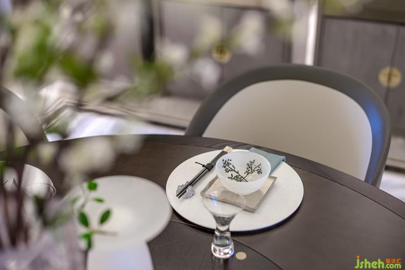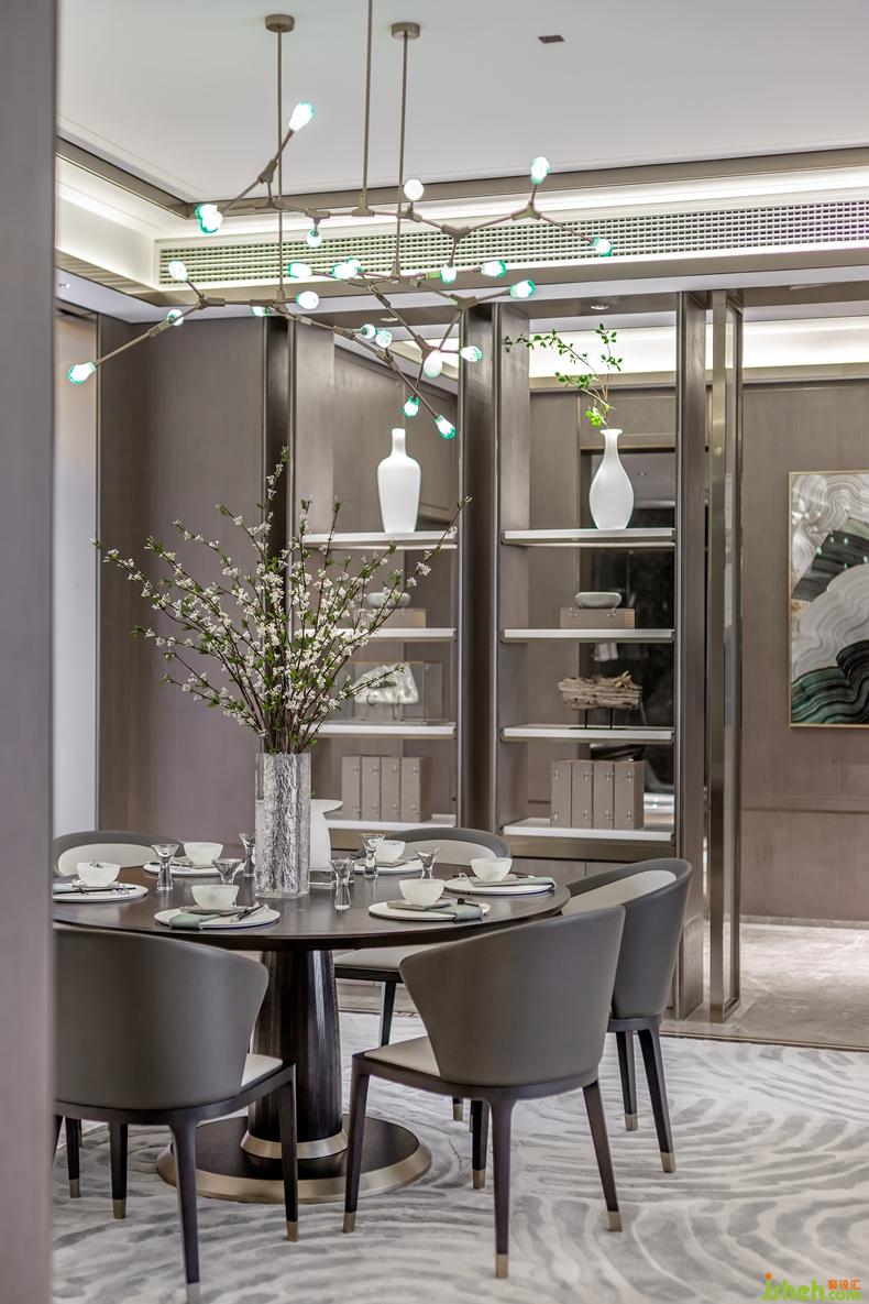 極具設(shè)計(jì)感吊燈為空間加注靈氣,餐桌餐椅與空間整體色調(diào)一致,給人沉穩(wěn)尊貴印象,杯盤溫潤,加以金屬構(gòu)件裝飾,為視覺路徑創(chuàng)造停留點(diǎn)。