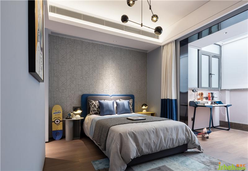 男孩房的色彩跳脫于整體空間的灰藍,采用充滿活力的天空藍和動感黃做為跳色,通過豐富的飾品:天文望遠鏡、星空主題吊燈、卡通版宇航員擺件、滑雪板道具等策劃出一場精彩的探險之旅,滿足小男孩勇敢冒險的天性。