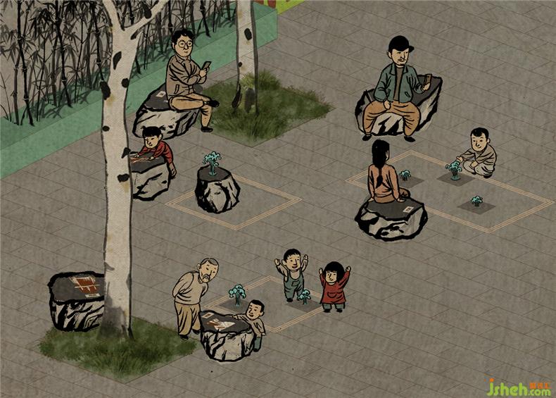 農(nóng)耕文化展示區(qū),緊臨商業(yè)街與天橋大階梯,設(shè)計考慮日后使用場景,營造放松、愉悅的開放空間。景墻將勞作場景以剪紙藝術(shù)形式趣致微妙的呈現(xiàn)??逃懈魇睫r(nóng)具的坐凳自由散落于空間,裝修設(shè)計可供游客與居民在此休憩,旱噴讓空間靈動且充滿趣味。