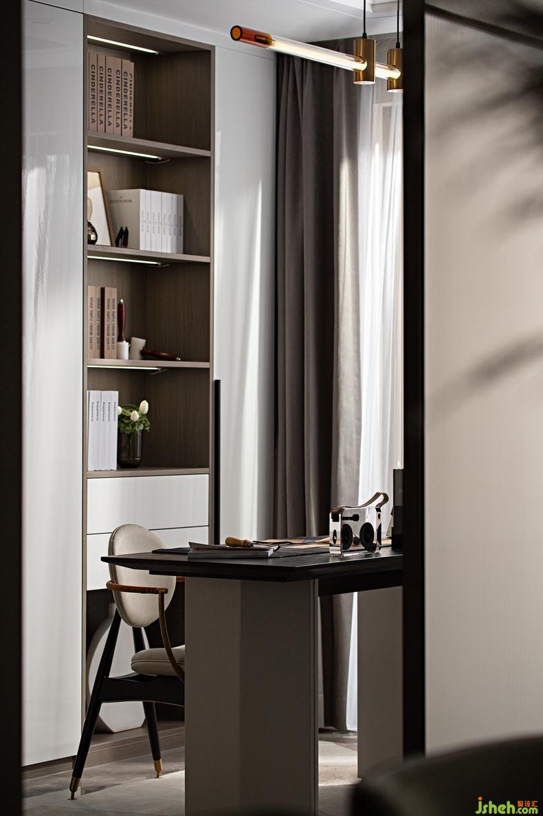 純粹的美學(xué)在書(shū)房持續(xù)延伸,在動(dòng)線的開(kāi)合中更多了一些社交的空間表述,簡(jiǎn)約的柜體置物搭配象征品味的靜物收藏,隨著落地的光影,享受愜意清閑和生動(dòng)繁忙的自由切換,在精致中完成輕奢的追求。