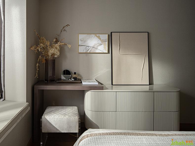 當(dāng)主臥被注入藝匠的詩(shī)意,一點(diǎn)一滴都是居者對(duì)美的私心,在純凈簡(jiǎn)白的色彩基調(diào)下,置入當(dāng)代低奢的家具陳設(shè),樣板房設(shè)計(jì)石狀的肌理和皮面的包裹,入光的飄窗,簡(jiǎn)約的置景,都詮釋著居者對(duì)生活品質(zhì)的定義。