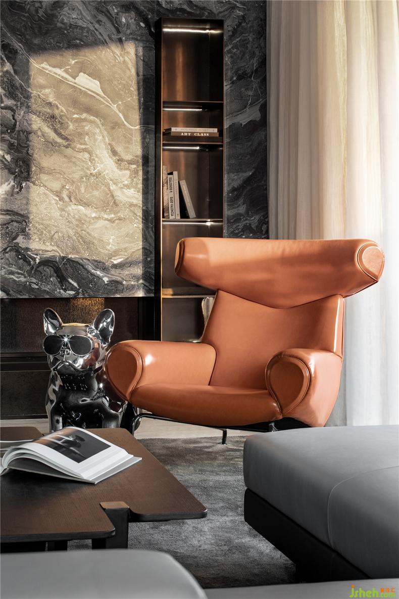 大理石、木紋肌理、皮質(zhì)、分別呈現(xiàn)出硬、中性、軟,以及冷、中、暖的質(zhì)感,空間內(nèi)三種材質(zhì)的碰撞出“剛?cè)岵钡姆諊凇吧菥印敝须[喻精致,在“簡居”中勾勒活力。