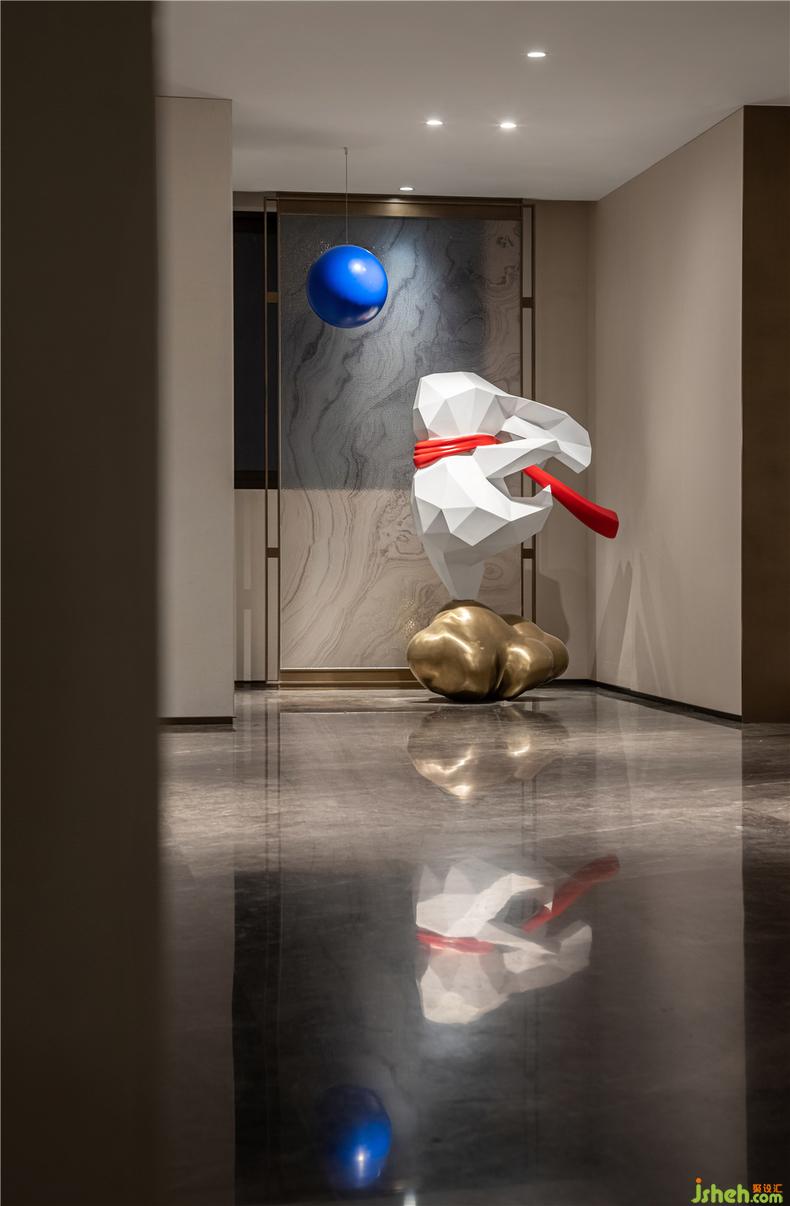走廊一隅丨雕塑《追》丨腳踏云彩追尋夢想,向往未來(藍(lán)球),再顏色上圍合主題調(diào)色:紅藍(lán)、金屬材質(zhì)的云更符合整理空間氣質(zhì)。