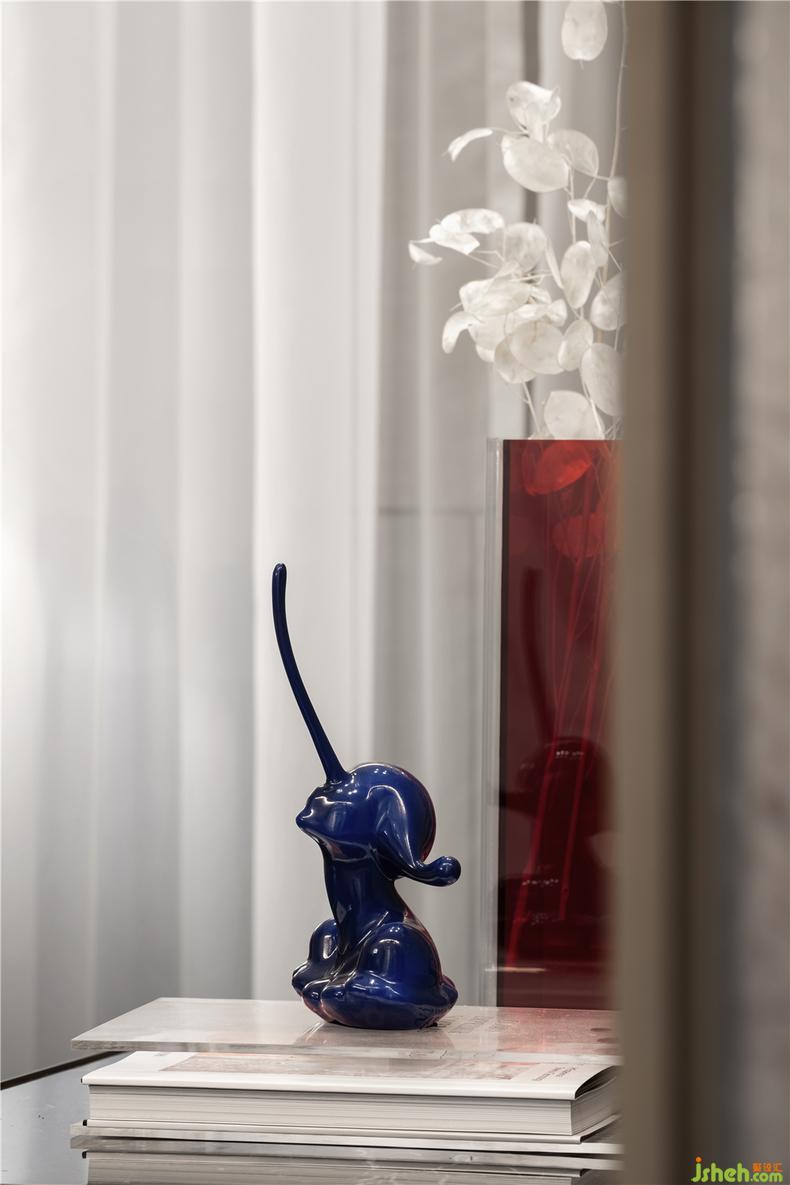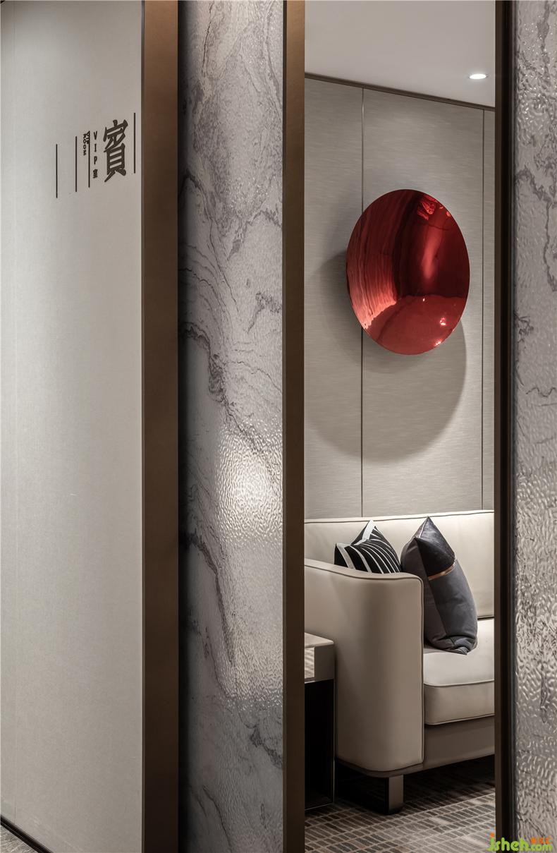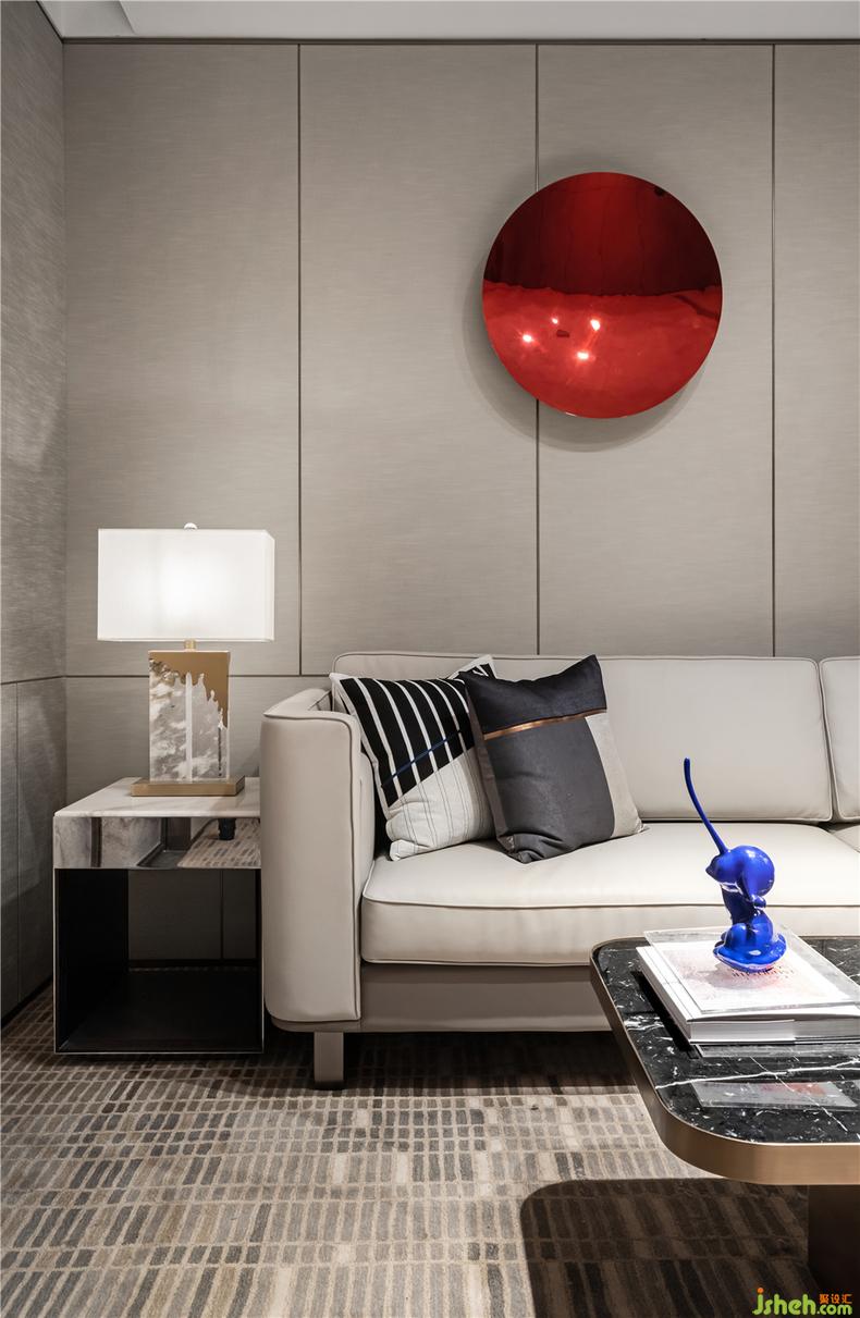 簽約室 丨紅藍(lán)的碰撞在原本沉穩(wěn)華美的空間里跳躍,金屬與燈光的映照提供一個使人沉浸和愉悅的氛圍,售樓處裝修設(shè)計使得我們的眼睛和所有的感官被誘醒,去形成一個從進(jìn)入開始的完整的體驗感。