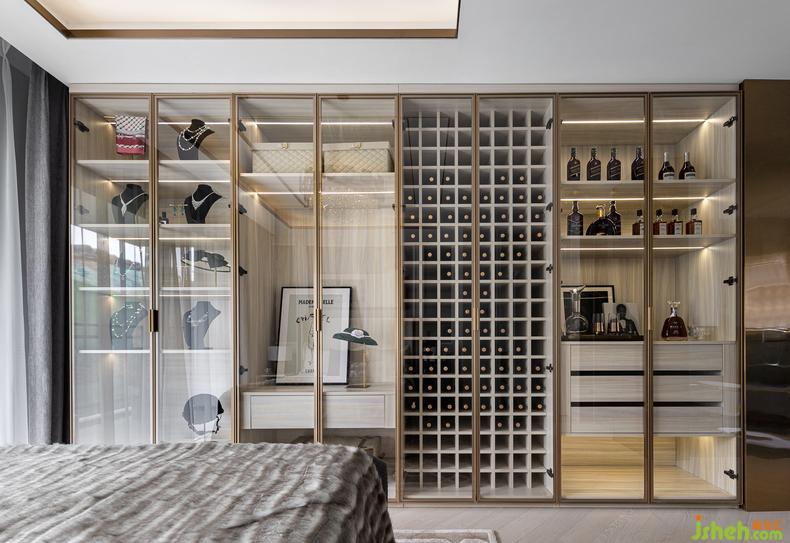 主臥細節(jié)丨整面展示區(qū)域鑲嵌于起居的空間,開闊的視野顯而易見,無論是衣帽鞋物的拿取,還是收藏愛好的展陳,都讓主人擁有觸手可得的收納空間,時刻享受著悅心而動的感官體驗。