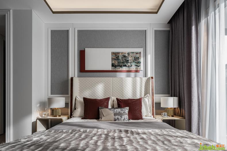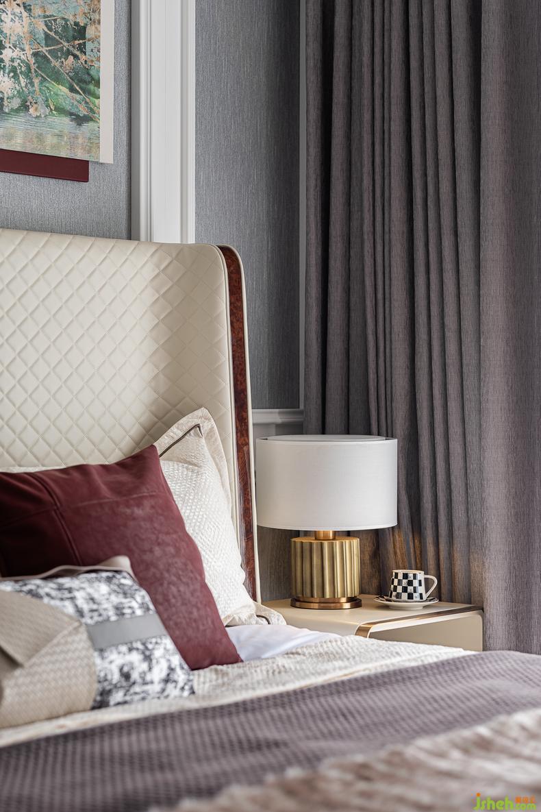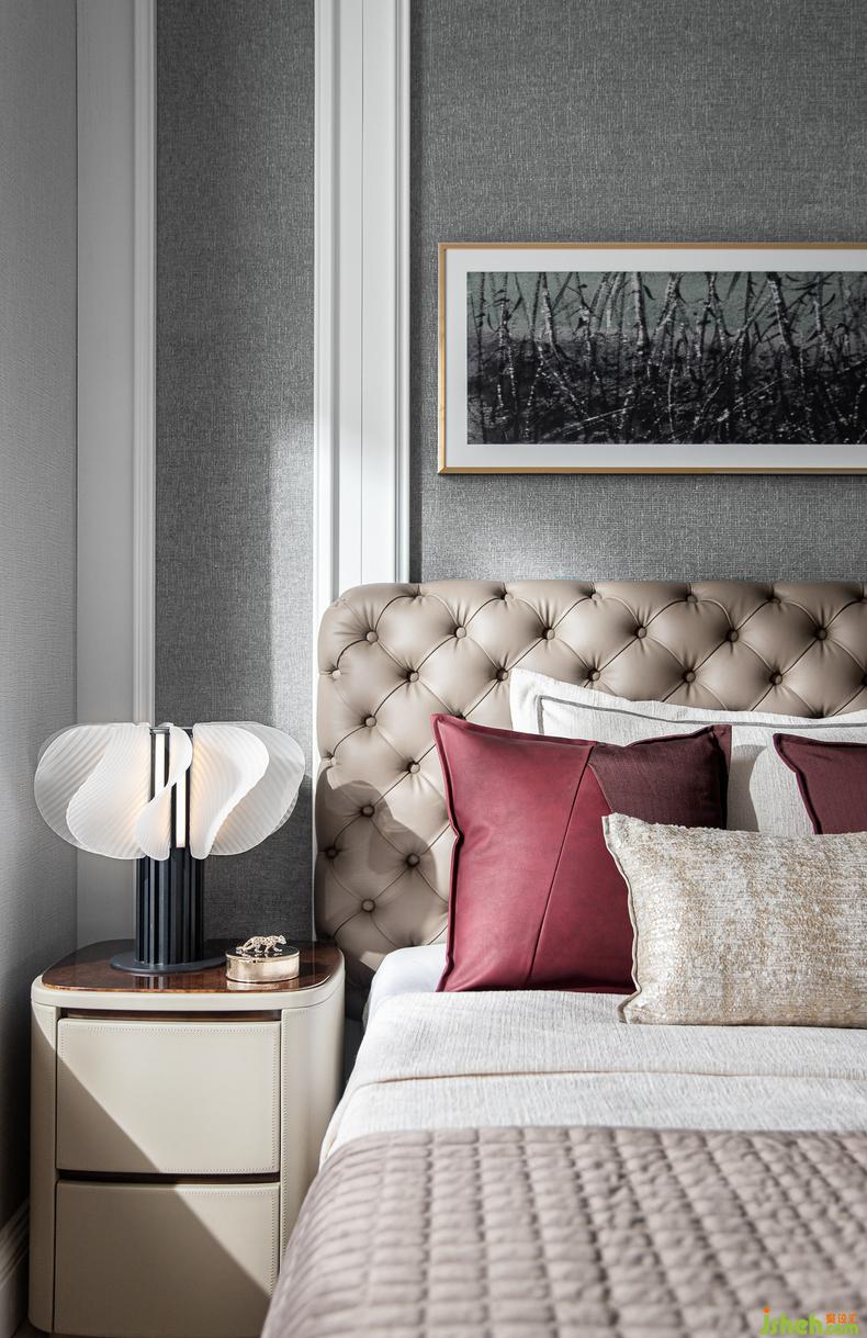 素色的墻紙與富有肌理的墻布相結合,斜型格紋的床頭框線呈現(xiàn)著最精確的視覺比例,室內(nèi)設計師再搭配絲絨酒紅的色彩點睛,讓起居的場景在舒適和諧之上,演繹著尊貴奢華的生活體驗,沉穩(wěn)大氣,格調(diào)高雅。