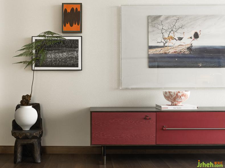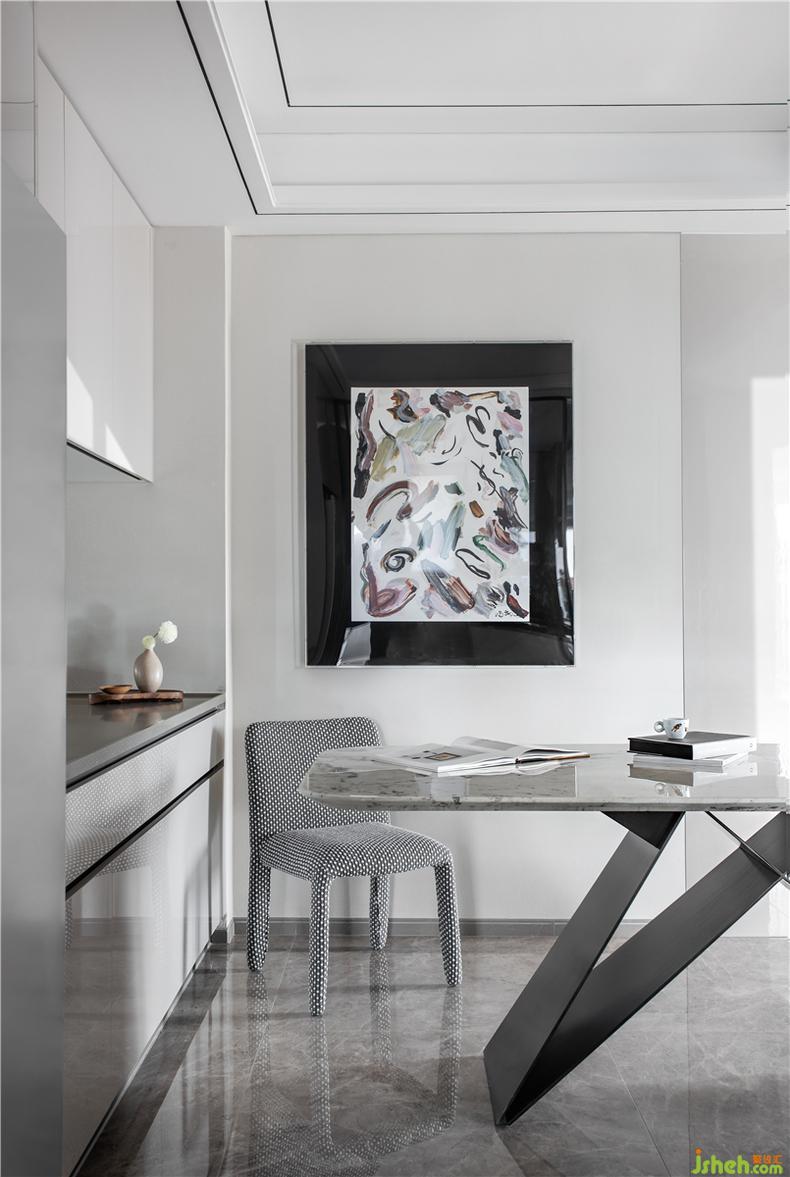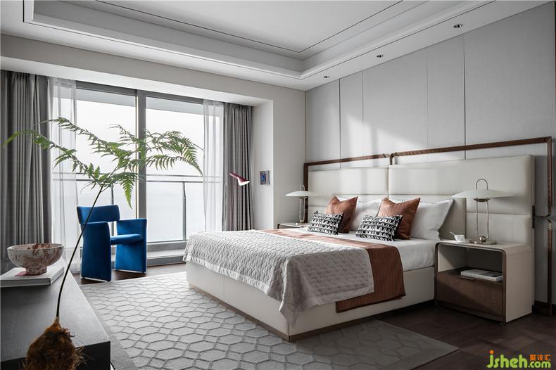 進(jìn)入主臥,映入眼簾的是主墻面與家具使用了冷白的材質(zhì)肌理,輔以暖色調(diào)的線條、鯨藍(lán)色的座椅、禪靜的綠植醒目清新,而抽象的畫作及裝飾都是主人的收藏品,作為陽光灑落室內(nèi)的關(guān)系色彩,讓居住在理性之中擁有溫柔的姿態(tài)。