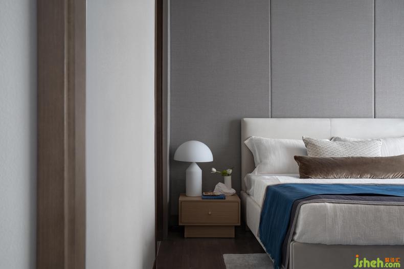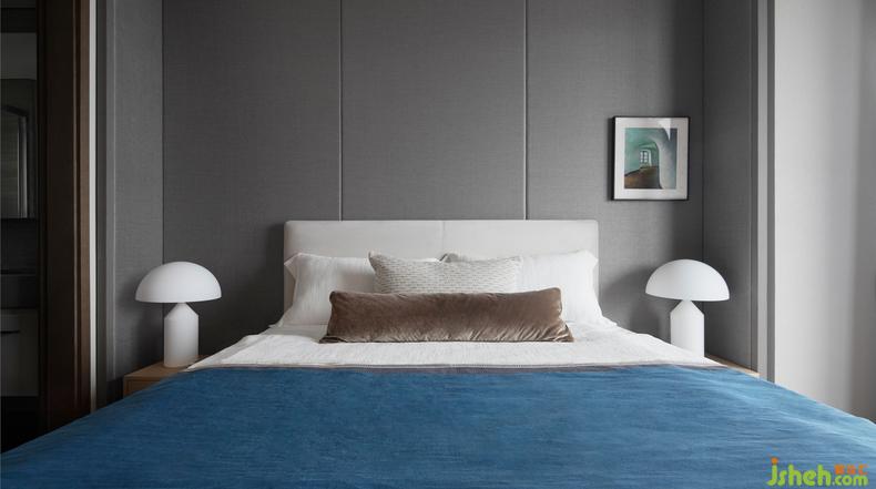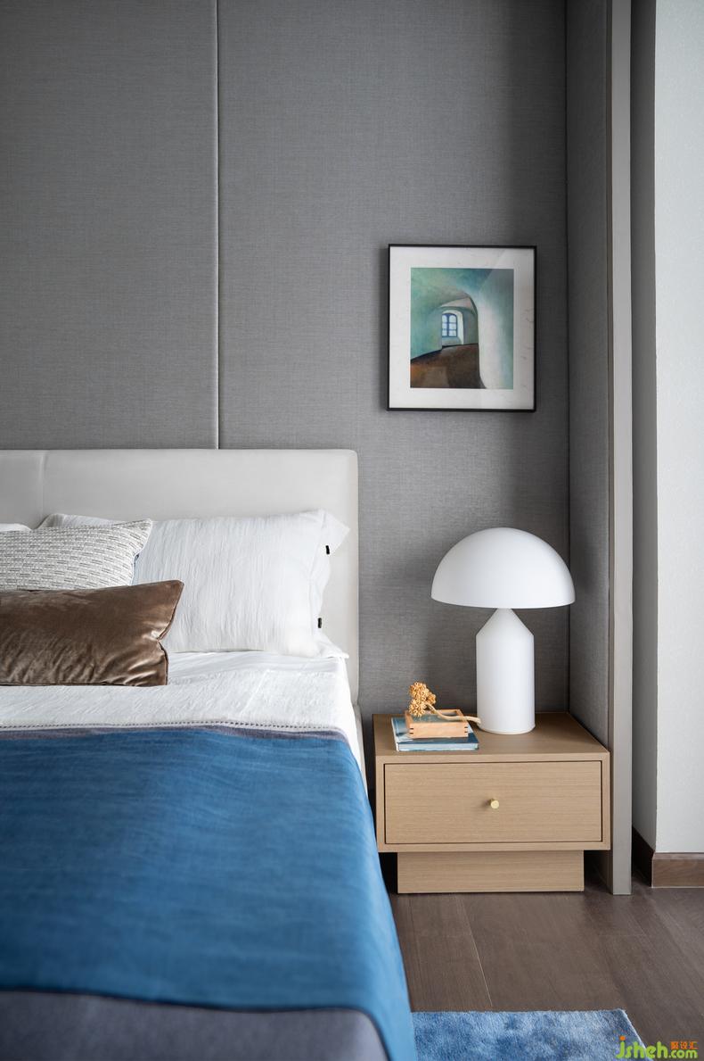 主臥丨男主人如山一樣穩(wěn)重,女主人如海一樣純粹,根據(jù)他們的個(gè)性打造了這樣的空間,室內(nèi)設(shè)計(jì)師灰調(diào)與藍(lán)調(diào)給予了空間無(wú)盡的包容性,傾聽(tīng)靜謐與自然,用一抹隨性的畫作、一盞異形的輔燈,為空間增添無(wú)盡的藝術(shù)魅力。