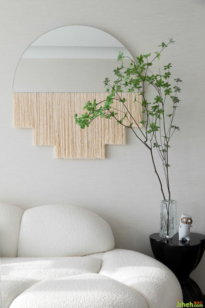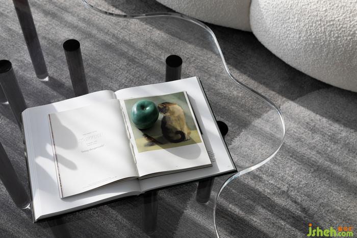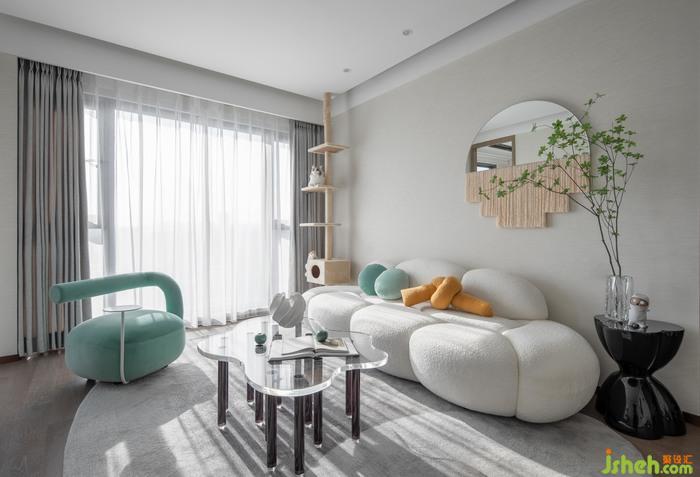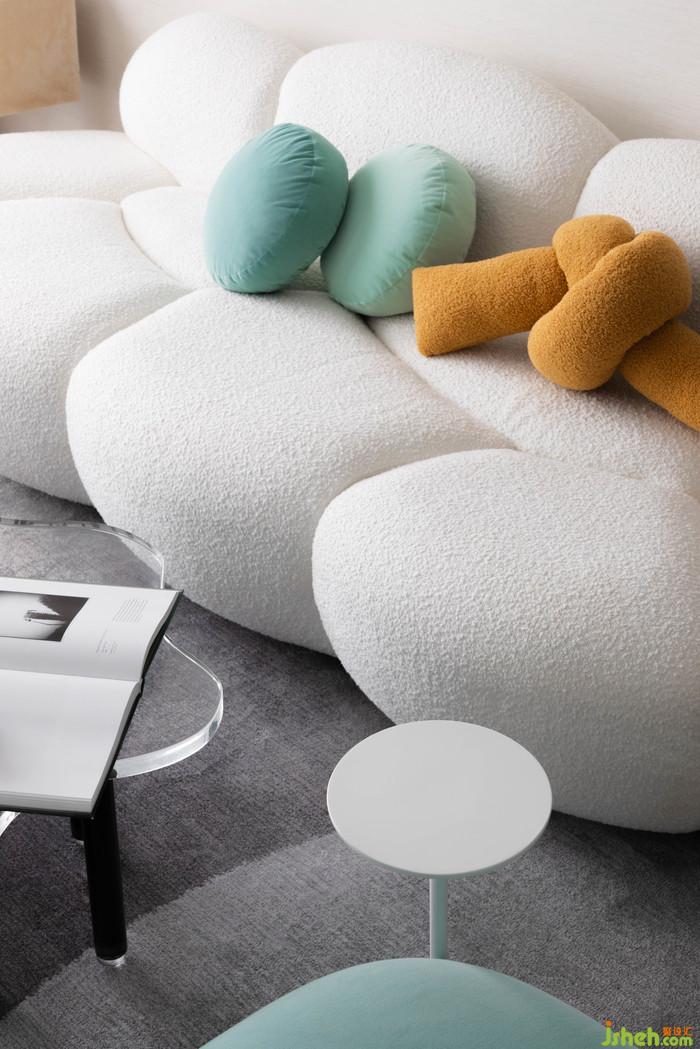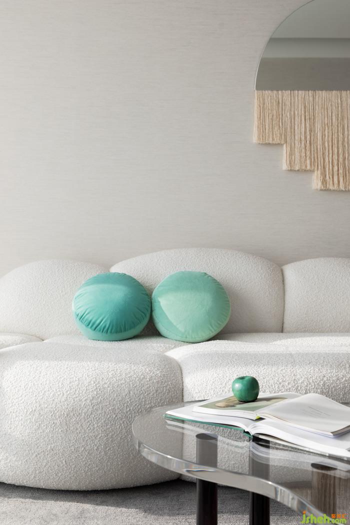 客廳丨異型的毛料沙發(fā),亞克力桌幾的不規(guī)則寫意配比,通過(guò)富有動(dòng)感的線性褶皺增強(qiáng)了半透明效果,給視野無(wú)盡的柔和與創(chuàng)意,讓客廳的互動(dòng)空間充分響應(yīng)了來(lái)自生活的治愈,即使漫游其中,既可以通過(guò)不同的視角,感受空間的暢意