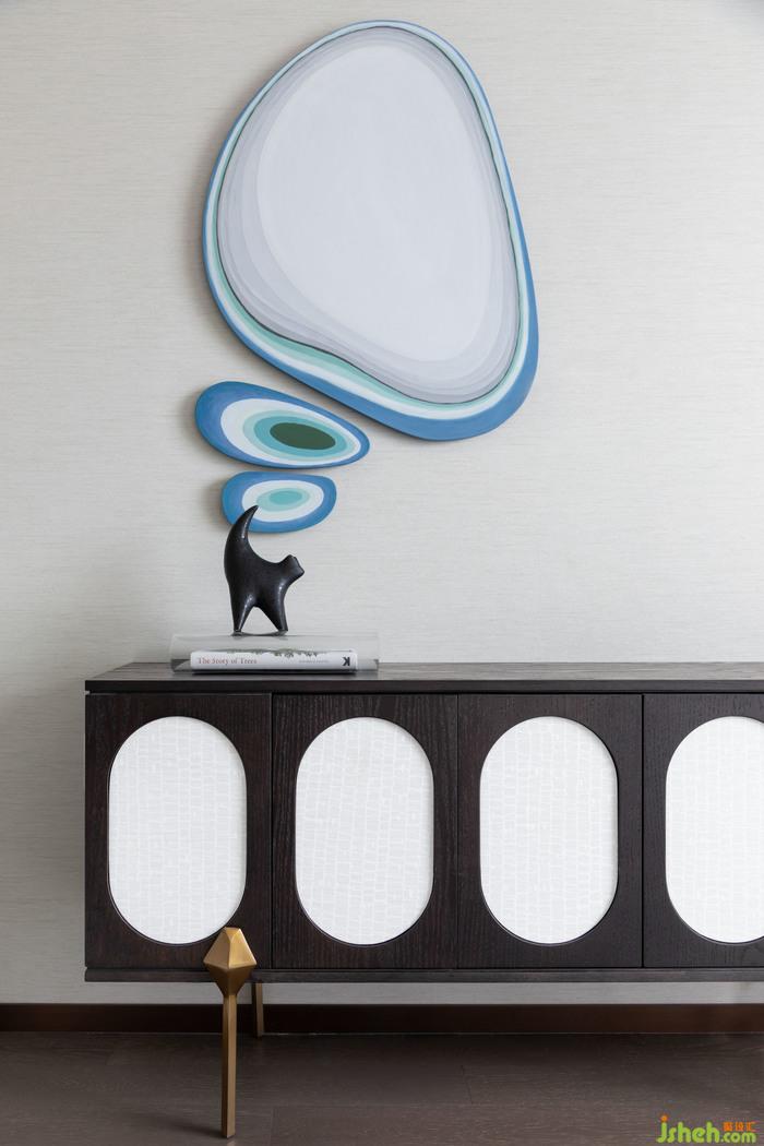 客廳細(xì)節(jié)丨在客廳的空間里,細(xì)枝末節(jié)都是對(duì)舒適一次具象感官的演繹,方正的空間在暖調(diào)的光影包裹下,泛著柔和的氣泡,寫意的壁畫,創(chuàng)意的陳設(shè),打破了空間的界限,在不同形態(tài)的幾何體塊的鋪陳下,促進(jìn)了邊界空間內(nèi)的現(xiàn)象學(xué)敘事