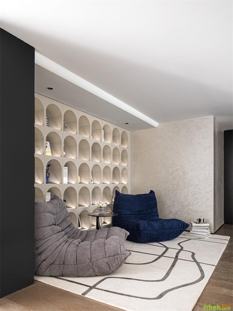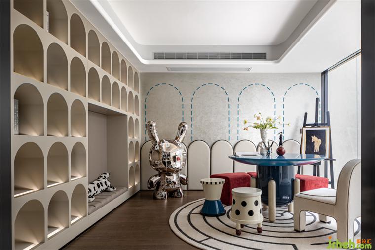 娛樂(lè)室丨這是家中孩子的舒適區(qū),撞色的‘象型家具’(以自然元素造型設(shè)計(jì)的家具)顯得更具生活感與童趣,墻邊的軟包既起到了裝飾的作用也增添了美感;整面拱形元素的柜體借喻童話的美好,樣板房設(shè)計(jì)整個(gè)空間讓孩子們可以暢玩想象。