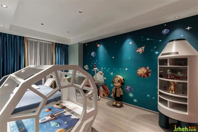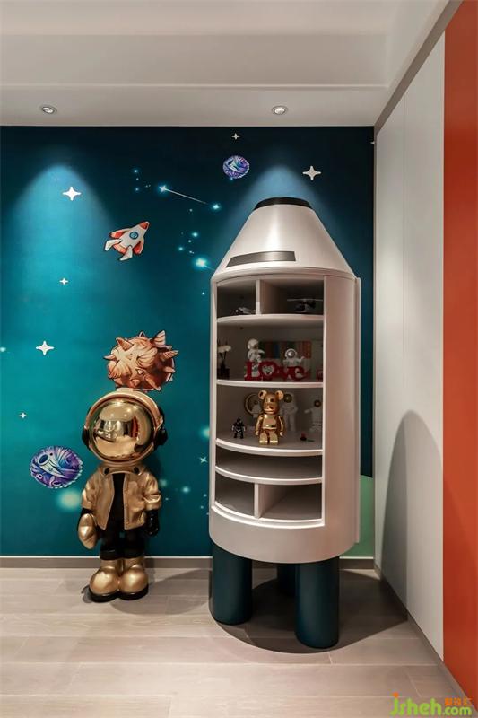 每個男孩子心里都有一個宇航員夢,用宇宙系列的裝飾畫裝點空間再合適不過。床是飛船,書柜是火箭,在這夢幻童真的空間里慢慢成長。