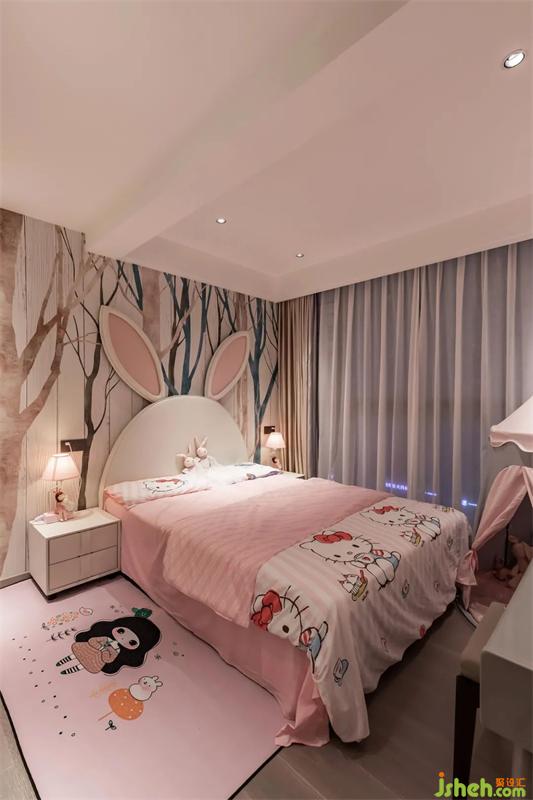 女孩房以森林主題為主基調(diào),床化成小兔子,融在床頭背景的粉色森林里,夢幻而浪漫。