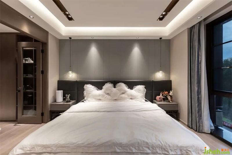 深圳別墅設(shè)計加入溫潤的木質(zhì)元素作為點綴,在臥室呈現(xiàn)出一種寧謐,又富有張力的美感,驚艷之余,又有一種靜謐和舒適的感覺。