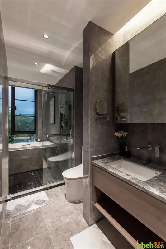 主衛(wèi)采用干濕分離的設(shè)計,保證生活品質(zhì)。盥洗區(qū)上部的鏡柜除了方便檢查儀容,內(nèi)部也是相當(dāng)能裝。下部的木色抽屜滿足零碎物品的收納,不落地的設(shè)計更添輕盈。
