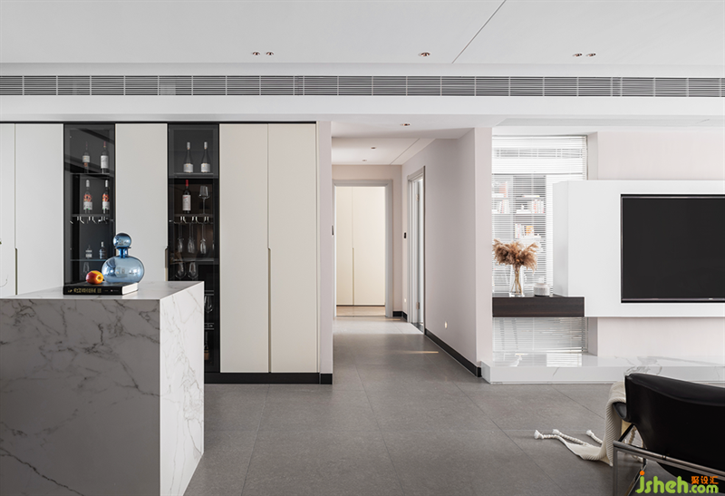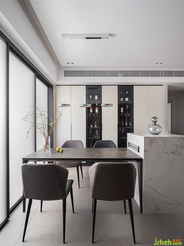 酒柜鑲嵌于整塊墻壁之中,在無風無雨的日子里,約上三兩好友,共同品鑒紅酒,搖曳的燈光與甘醇的酒香是高品質生活的顯露。