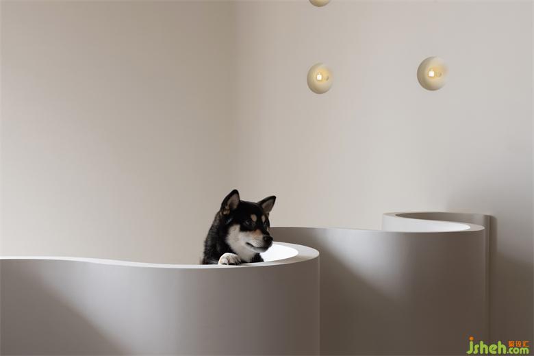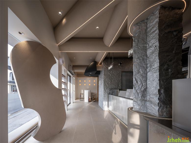 順著旋轉(zhuǎn)樓梯拾級而上,建筑內(nèi)不規(guī)則造型的洞穴、連接梁和弧形墻是設(shè)計師尋找語匯回應(yīng)自然召喚的實踐,CoCo設(shè)計形成了一步一景的場景畫面感,也讓空間平添了幾分關(guān)于未來感的隱喻。