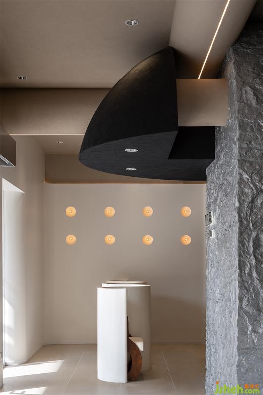 出品區(qū)的漸變墻體還原出山谷的質(zhì)樸拙意,光與影的介入打破了單一色調(diào)帶來的沉悶,在間接光源的暈染下,巖石表面立體觸感的肌理,伴隨著不銹鋼臺面折射出的粼粼波瀾,粗獷中裹挾著微妙細(xì)膩感,賦予來客心靈回歸自然的生命氣息。