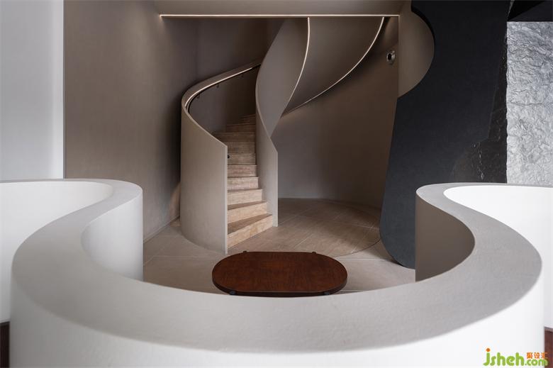 Climbing up the spiral staircase, we notice that the designer closes to nature by designing irregular shaped caves, connecting beams and curved walls, forming a changing scene with every step, and adding some metaphors about the future sense to the space.