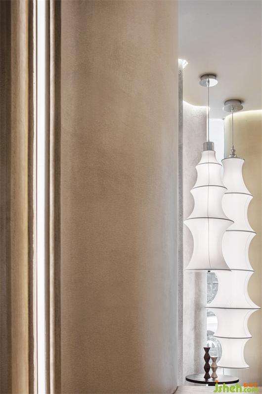 不同造型和材質(zhì)的桌椅有序分布,通過座椅高度的變化,實現(xiàn)幾何關(guān)系高低錯落的穿插,增加空間的層次感??v向的幾何形吊燈拉近了人與空間的關(guān)系,在不同的光源聚焦點均可獲得沉浸式體驗,使消費者在享用茶飲的同時,能享受片刻獨處的悠然時光。