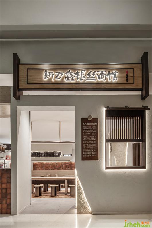 面館設計門頭化繁為簡,以現(xiàn)代手法引入蘇派建筑元素。木與磚、幾何形體與弧線穿插疊加,模糊空間邊界的同時,打造虛實交錯的沉浸式感官體驗。斑駁的墻面輔以燈光的點綴效果,為粗糲的外觀揉入一抹超越時空的精致,予人充滿煙火氣息的溫情風貌,使整個餐廳獨立于商場復雜而又多樣的環(huán)境,形成獨特的視覺焦點。