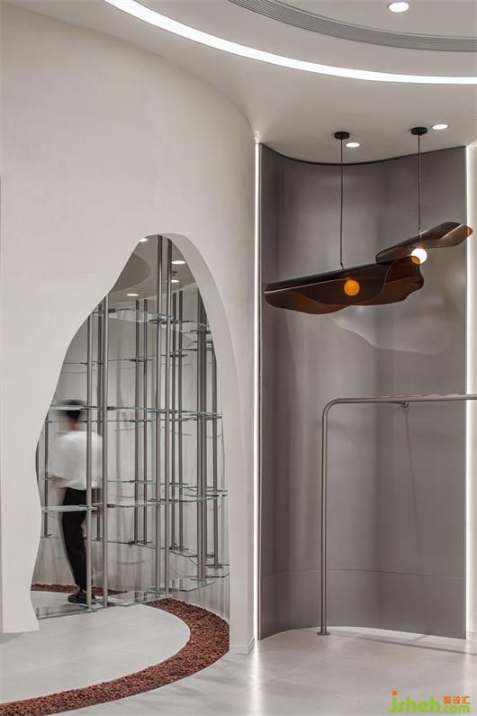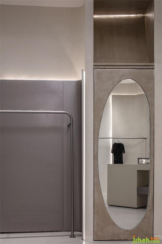 室內(nèi)借由線面、體塊以及色度上的調(diào)和,奠定清爽簡練的空間氛圍,買手店設計在遞進與交互之間詮釋出靈動的層次之美。圓與方、曲與直、明與暗的拿捏思考,貫穿整個空間,微妙的平衡打破了棱角分明的常規(guī)邏輯,又從動態(tài)上將每個功能分區(qū)彼此連接。