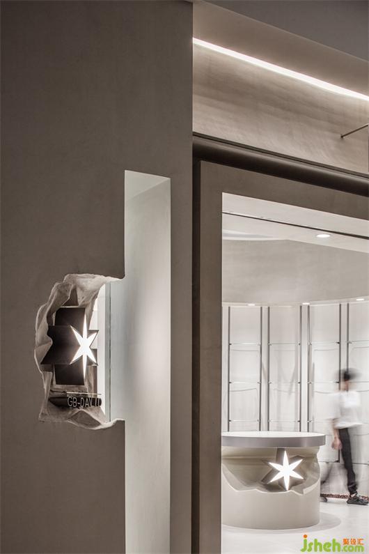 This case is the first fashion design buyer store in Wuxi that focuses on designer brand authorization and provides unique experience to consumers. It is also the first brand to reach cooperation with GB DAVID CUBE buyer project. Hexagram star is the unique logo of GB DAVID. The design team decorated it on the outer wall and island platform in the form of embedding, and polished the carved traces around it. The extreme roughness and delicacy are integrated in the collision, which respond to the positioning of manual customization and no complication of the brand, as well as concretely expound the preciseness and delicacy of the selection process of the manager.
