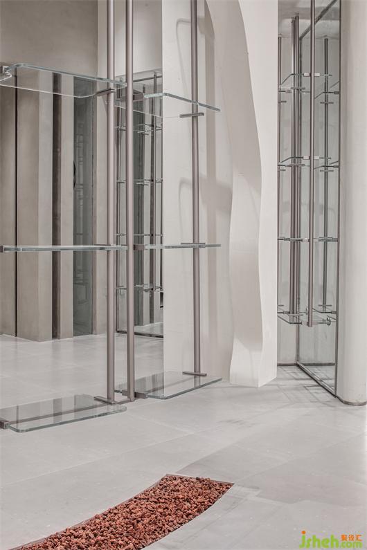 Through the GB Handmade Bag exhibition area, the ceiling of the clothing display area continues the smooth lines of the front hall. The scattered main and auxiliary light sources are full circles, which softens the boundary feeling brought by the irregular outer edge of the space. At the same time, the product itself becomes the only focus, which naturally attracts the attention of consumers to the central jewelry display cabinet and the surrounding clothing display racks. The floor decoration and exhibition rack also maintain a certain curvature, which can not only neutralize the visual coldness brought by a large number of metal materials, but also echo with the ceiling, and "divide the irregular space into whole" through a variety of lines.