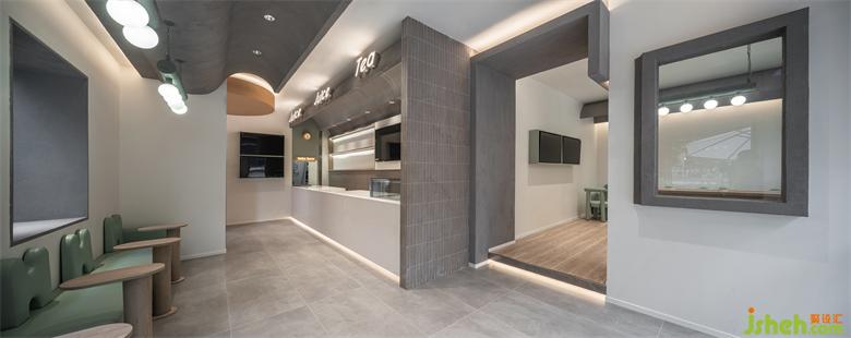 推門而入,室內(nèi)沿襲了外觀的簡約與內(nèi)斂,以奶茶色和高級灰為主調(diào),輔以原木、淺綠,奶茶店設(shè)計為空間注入清新、自然的意蘊(yùn),奠定一種溫馨、治愈的社交氛圍。設(shè)計師運(yùn)用現(xiàn)代建筑思維方式,從曲線與直線的組合中,擷取并延伸出有規(guī)律的形體來構(gòu)筑空間關(guān)系,打造通透開闊、層次分明的餐飲環(huán)境。
